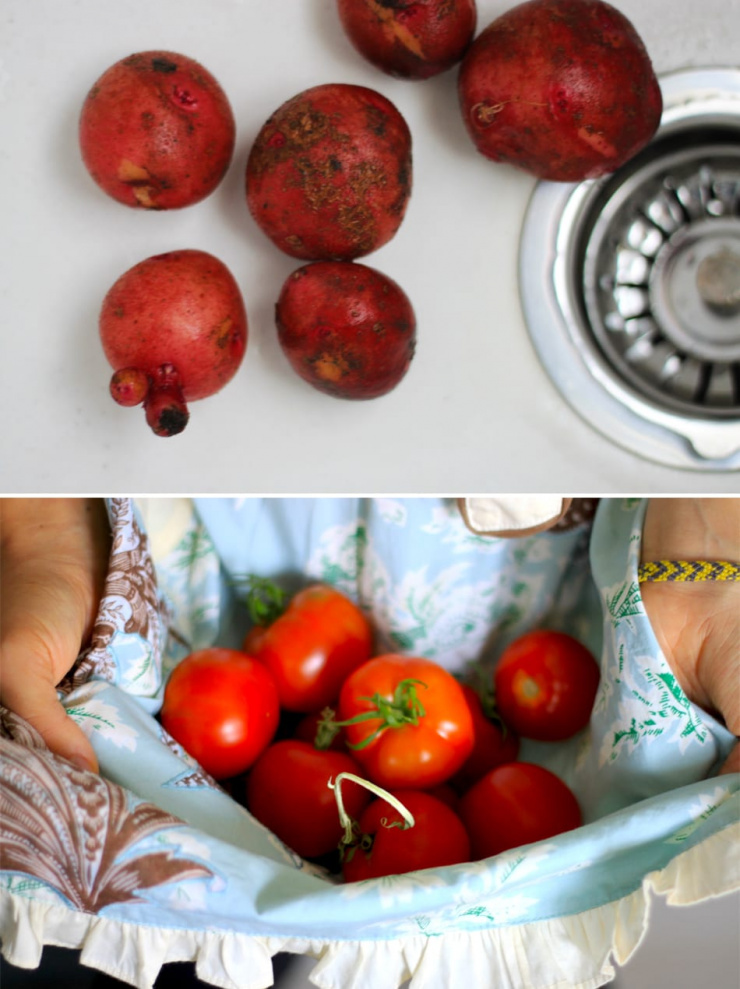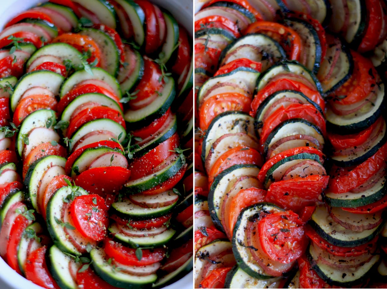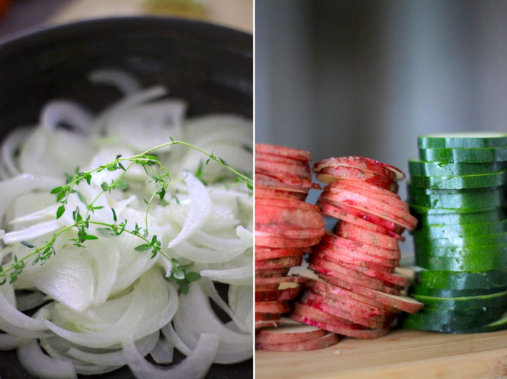 - Grease a 2 quart baking dish with some of the olive oil. Place the sautéed garlic and onions on the bottom of the dish. Layer the zucchini, potato and tomato slices in the pan in rows or circles, whatever works for you. Arrange them around until the dish is full (there might be leftover slices of vegetables). Drizzle the remaining tablespoon of olive oil on top. Remove the leaves from the remaining 3 thyme sprigs and scatter them around the surface. season with salt and pepper and cover with foil.