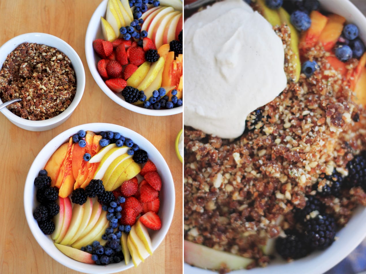 - To assemble: Place sliced/chopped fruit into a bowl and drizzle lightly with agave. Sprinkle a teeny bit of cinnamon if you like. Spoon some crumble mix evenly on top of the fruit and put a big dollop of almond cream on there.