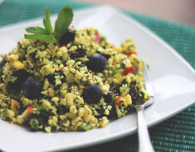 Couscous! The food so nice, they named it twice. Except this isn’t couscous. It’s cauliflower in a funny little disguise. From first glances this looks like a lovely grain salad with some chopped herbs, a bit of seasonal fruit and a sunny yellow curry dressing. But up close it’s a jumble of the teeniest cauliflower florets you could ever imagine mixed up with all of those great things. Neat, huh? I actually love eating cauliflower this way, it’s nice and crisp and kind of tricks me into eating more crucifers, the health all star of the veg world. Typically I roast it, but this dish is just too much fun