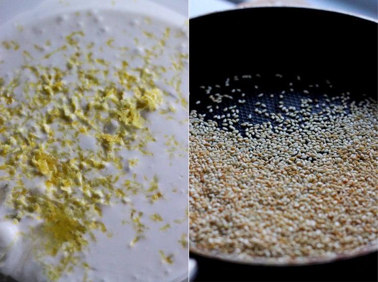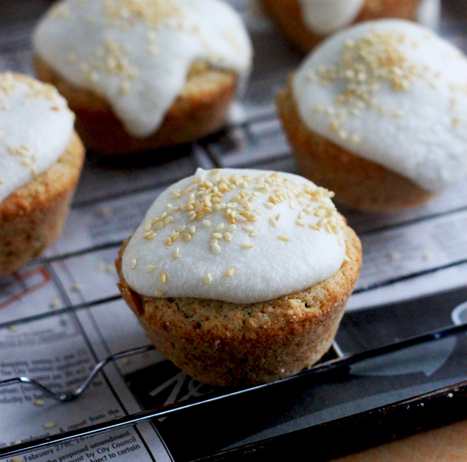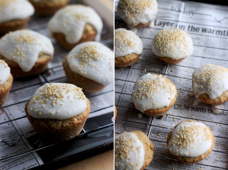 - Make the glaze. Retrieve the coconut milk from the fridge and whisk it up to ensure that it is completely smooth. In a small bowl, combine that remaining coconut milk (7 ounces) with the remaining tablespoon of lemon juice, ½ teaspoon vanilla and the agave nectar. Spoon on top of the cooled cakes and garnish with the toasted sesame seeds.