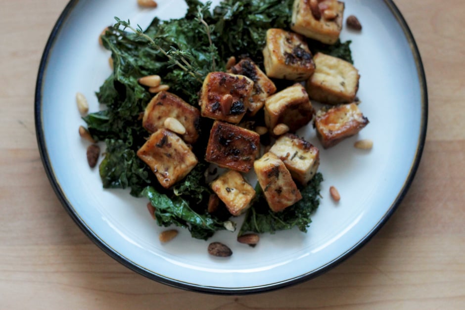 - Toss the kale with the remaining oil and lemon juice mixture in the large bowl. Remove the tofu from the oven and place the kale on most of the remaining space of the tray. Roast for 10 more minutes. Place pine nuts on the tray and roast for another 2-3 minutes, until tofu is quite browned, kale has wilted and crisped a bit and the pine nuts are golden.