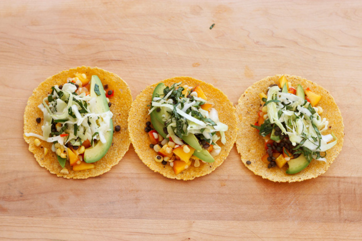 - To assemble: Place 1/4 cup or so of peachy corn filling in each tortilla, top with avocado slices and a good tongs-full of slaw. Eat immediately.