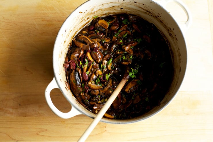 - Pour the stout into the pot, scraping up any brown bits at the bottom of the pan. Add the balsamic vinegar and soy sauce. Bring the mixture to a boil. Simmer for 5 minutes, or until liquid is reduced slightly. Remove from the heat. Stir in the olives and chopped parsley. Season the mixture to taste.