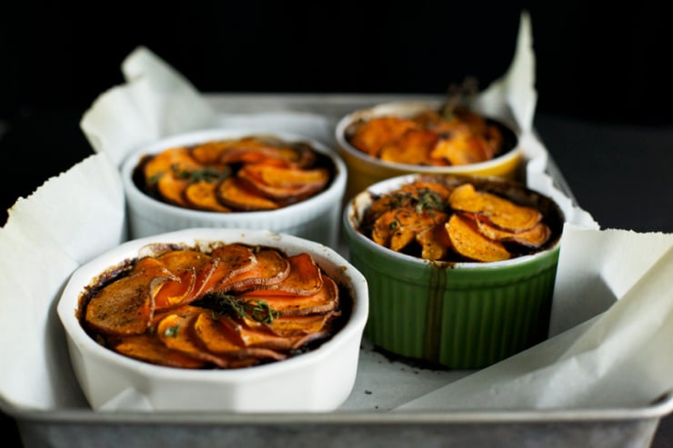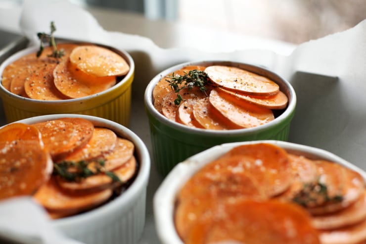 - Divide the mushroom mixture among 4-6 ramekins. Layer the sweet potato slices on top, overlapping the circles as you go. There should be 2 solid layers of sweet potatoes on top of the mushrooms. Brush the top of the sweet potato slices with the remaining oil, season the slices with salt, pepper and remaining chopped thyme. Bake pot pies for 30-35 minutes, or until mushroom mixture is bubbling and the sweet potatoes are browned and lightly crispy on the edges. Serve hot.