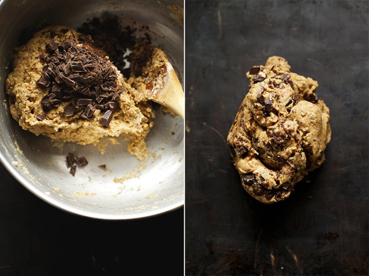 - In a large bowl, combine the whole and light spelt flour, ground espresso, sea salt, and baking powder. Stir to combine. To the flour mixture, add the melted coconut oil, agave nectar, and vanilla extract. Stir until a very crumbly/dry batter forms. Add the hot water to the mixture and stir until just combined. Gently fold in the chopped dark chocolate until evenly mixed throughout the batter.