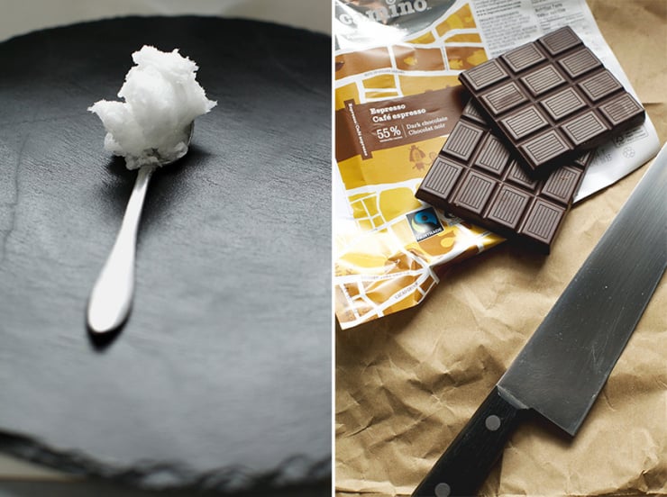 I had a dark bar of chocolate infused with espresso in my pantry that had to be used in this one glorious purpose. I thinned out my basic coconut cream recipe for a nice, fatty and sweet dollop of goodness to compliment the hearty structure and strong flavour of the scone. A dab of sour-sweet raspberry jam finishes this out nicely. Luxe breakfast or sweet snack, this part is up to you.