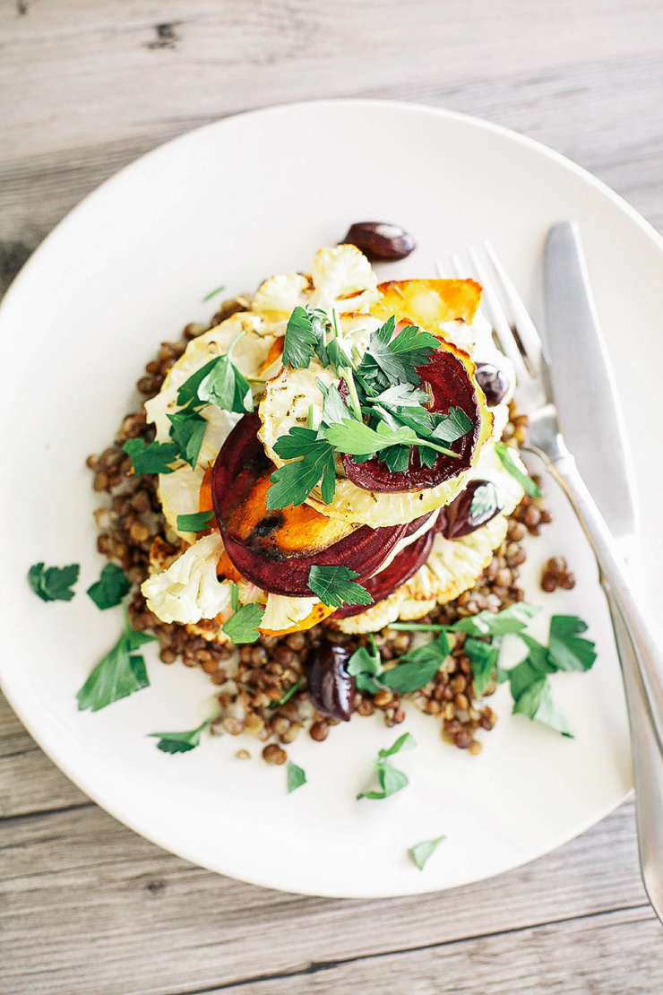 - To serve, divide the warm lentils among 2 dinner plates, pressing down on them with the back of a spoon to make a flat surface. Stack the roasted vegetables on top of the flattened lentils. Drizzle the whole thing with horseradish vinaigrette. Garnish with olives and chopped parsley. Serve warm.