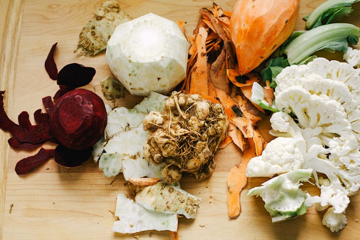 - Slice the celery root + sweet potato about an inch thick across. You want to cut them so that you get a large cross section for stacking. Cut one little portion off of the bottom of each vegetable so that you have a flat and steady surface for the vegetable to rest on the cutting board. Proceed to make slices from there.