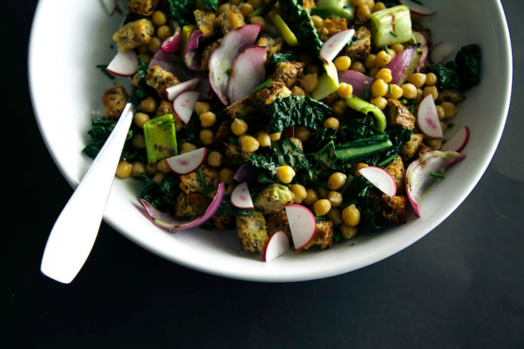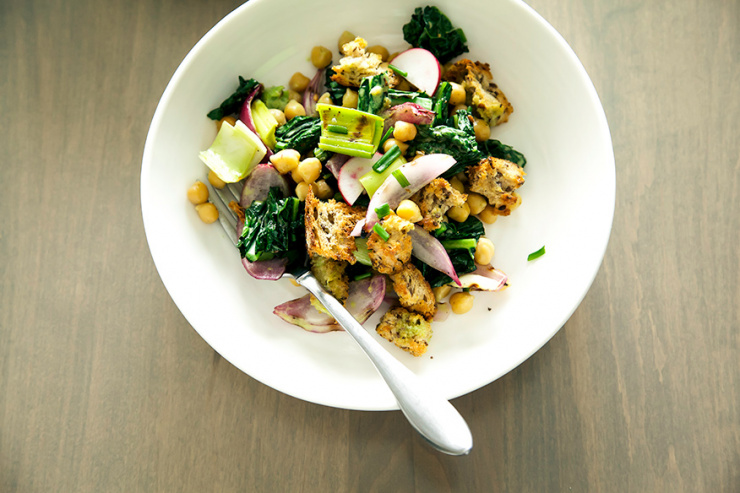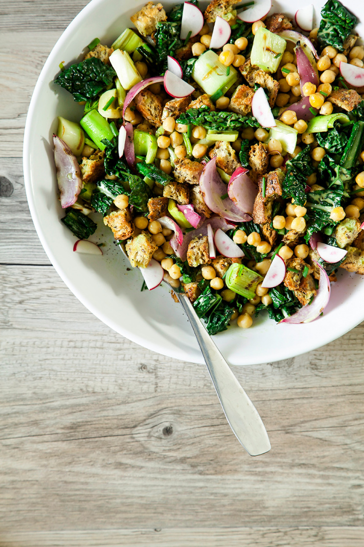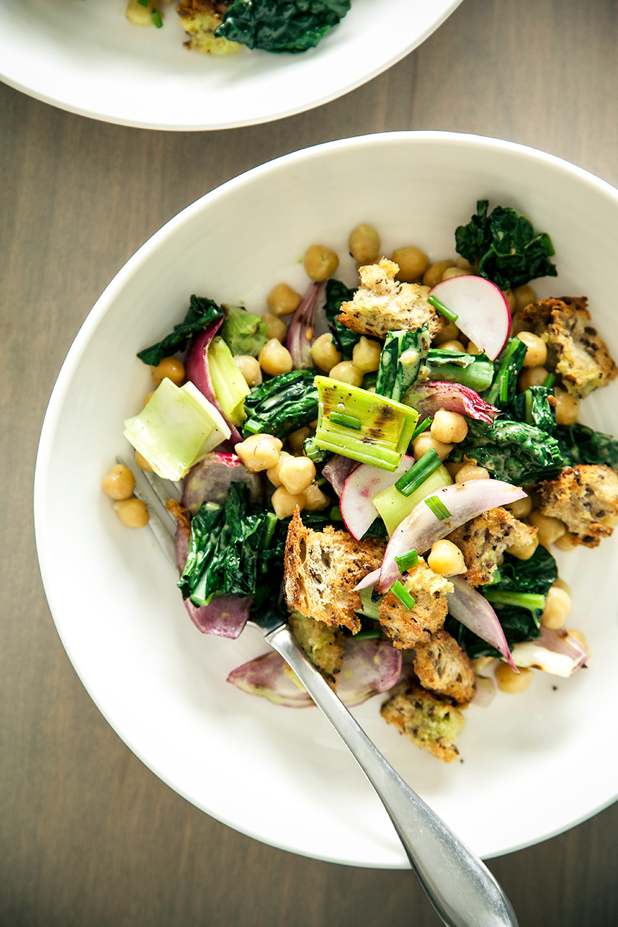 - In a large bowl, combine the chickpeas and toasted bread. Chop up the leeks, red onions and kale into bite size pieces and toss them into the bowl as well. Season the spring panzanella with salt + pepper if you like. Pour the dressing on top (you might have a bit extra). Toss everything together to combine. garnish the salad with chopped chives and sliced radishes. Serve immediately.