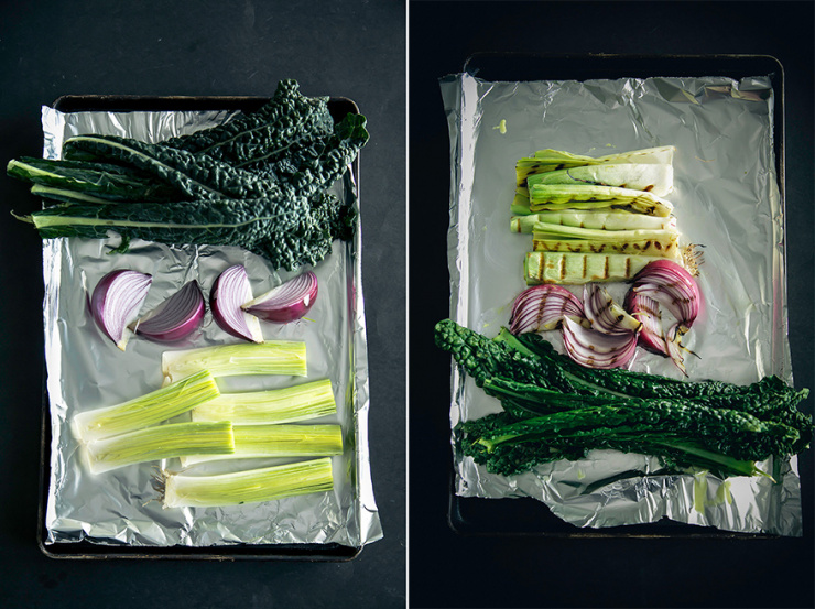 - Also, I grilled some of the vegetables, but have included instructions for oven-roasting here, since that seems to be more of an option for people. If you have a grill, just brush the veg with some oil, salt + pepper and place them on a medium-high grill until charred a bit and soft.
