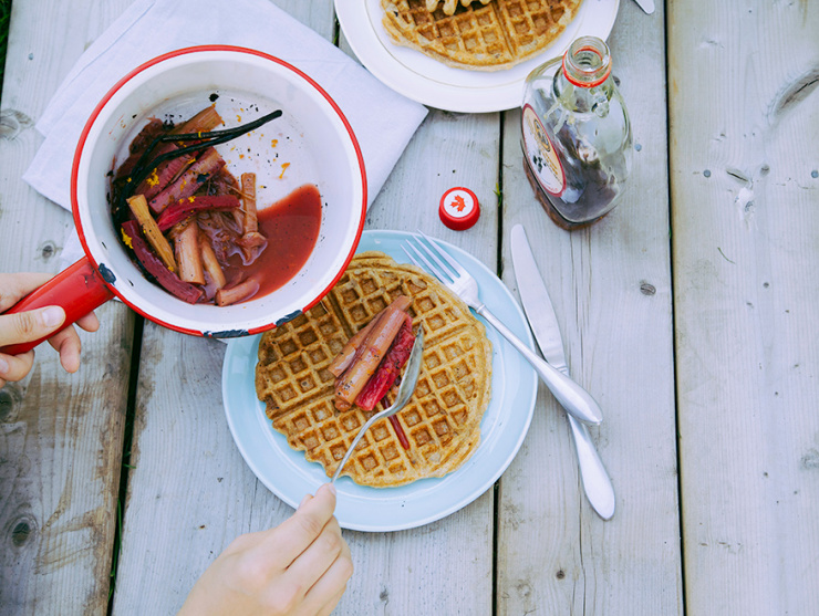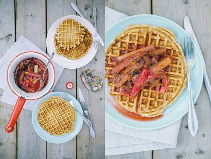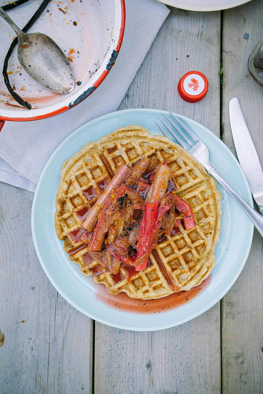 Raised Waffles with Buckwheat & Stewed Rhubarb