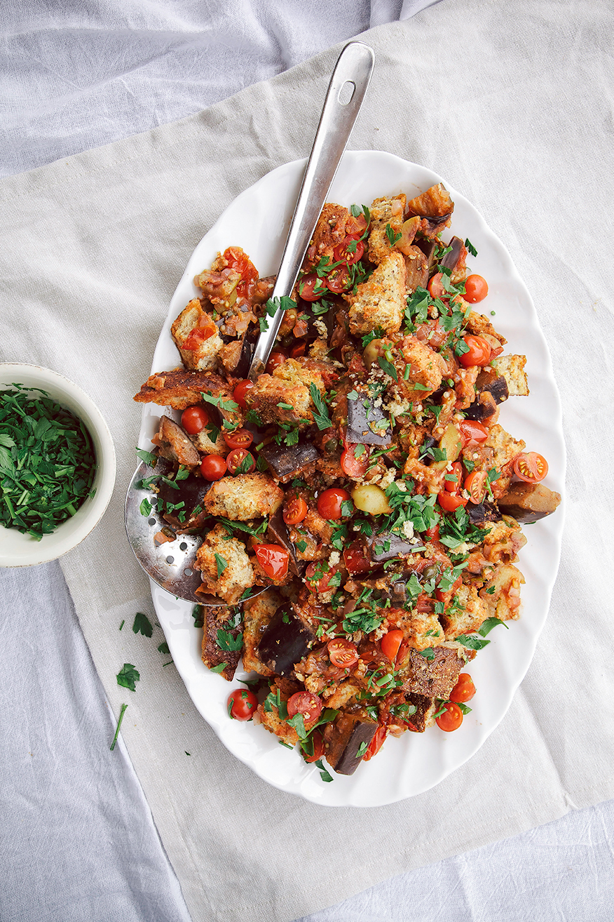 I know, more panzanella! I had the idea for this in my mind last week and could not let it go, couldn’t let it wait until next summer. Caponata is this irresistibly rustic Sicilian eggplant and tomato stew/condiment that comes together with some minor rough chopping and simmering. It brings out the meatiness of the eggplant to the point of serious questioning sometimes. There are wonderful salty bits, cooked out summer-tomato juices, a scatter of parsley leaves that have barely been grazed by the knife. Sweet, sour, salty–perfect on any and all toasts once it’s cooled. I thought I could cut to the chase and just throw the toast component right in there, mix it up real simple with another dose of olive oil, bursts of fresh tomato and even more grassy, peppery parsley. That thought was correct!