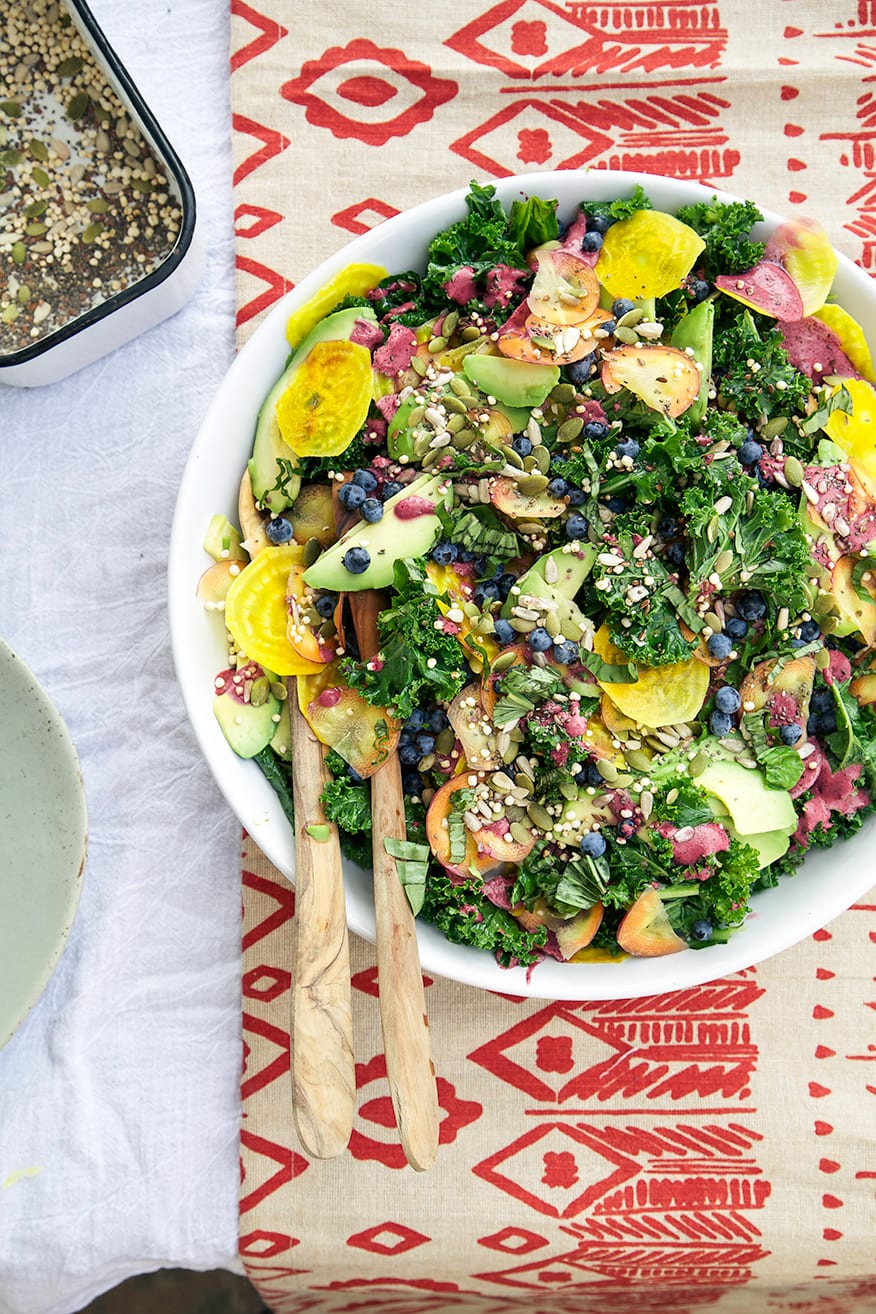 - Arrange the massaged kale and broccoli on your serving plate. Top the greens with the beets, carrots, avocado, chopped basil, and blueberries. Season the whole thing with salt and pepper again. Stir up the dressing (it should have thickened a bit) and drizzle it all over the top and garnish the salad with the omega seed sprinkle. Serve it up!