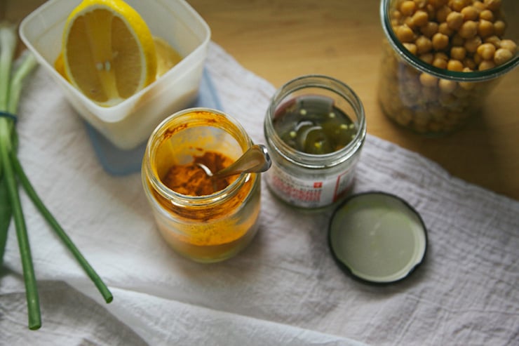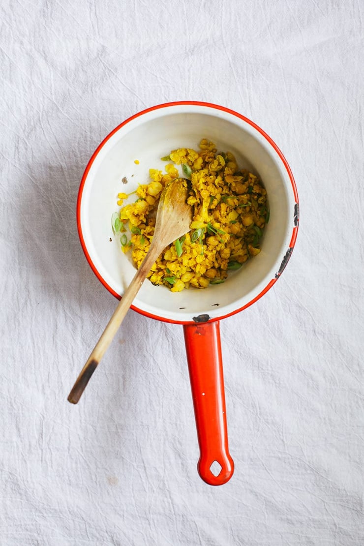 - In a sauté pan, heat a slick of olive oil over medium. Mash the chickpeas up with a fork, leaving some of them whole. Add the sliced white parts of the green onions and the turmeric to the pan. Stir them around until the green onions are slightly soft and the raw edge from the turmeric has faded. Add the mashed chickpeas and season the mix with salt and pepper. "Scramble" the mix in the pan until everything is hot. Stir in the rest of the green onions at the end.