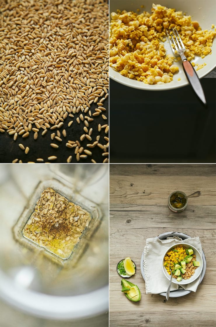 For now, I’ve been playing around with the savoury inspiration. This bowl is a mix of her greens + grains scramble and the California barley bowl with lemon yogurt sauce. Farro is one of my favourite grains because of the delightful chew. I add some “scrambled” chickpeas with scallions + turmeric, and top the whole heap of it off with some pickled jalapeños, ripe avocado, sesames, and a creamy lemony sunflower-based sauce. Along with the myriad of daily devotions going on, it’s my new favourite thing. Maybe make it yours too?