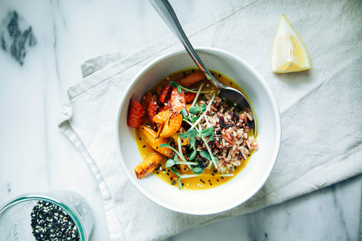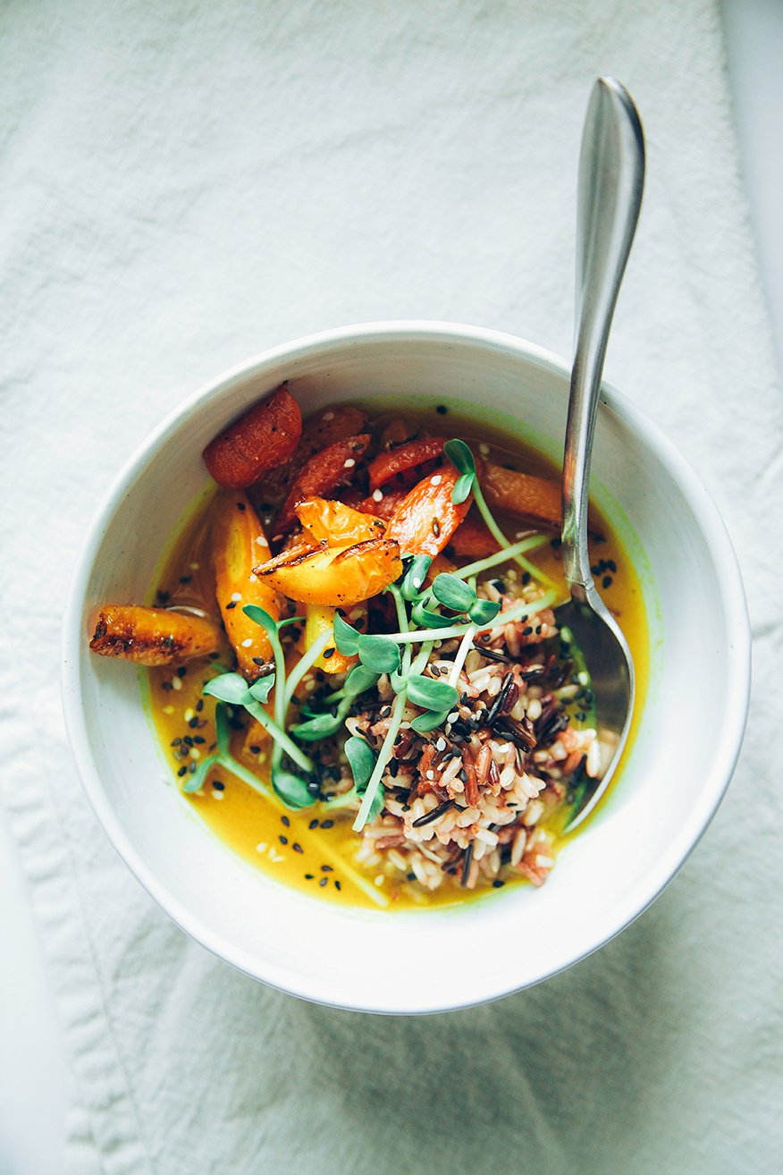 - Place the roasted carrots and cooked rice in a bowl. Strain the turmeric broth if you like, then ladle it on top. Garnish the bowl with sprouts and sesame seeds if you like.