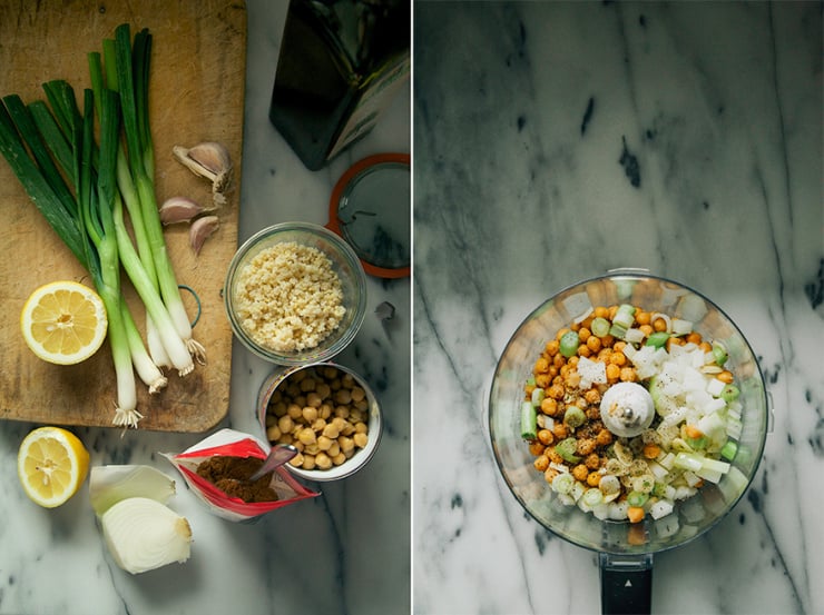 - In a food processor combine the chickpeas, garlic, chopped cooking onion, the chopped whites of the green onions, ground cumin, lemon juice, olive oil, salt and pepper. Pulse until you have a chunky paste and there are hardly any whole chickpeas left. Add the flour and baking soda and pulse a couple more times to combine. You should have a wet and chunky paste. Scrape this into a large bowl. To this, add the cooked millet, sesame seeds, and sliced green onion tops. Fold it all together to combine.