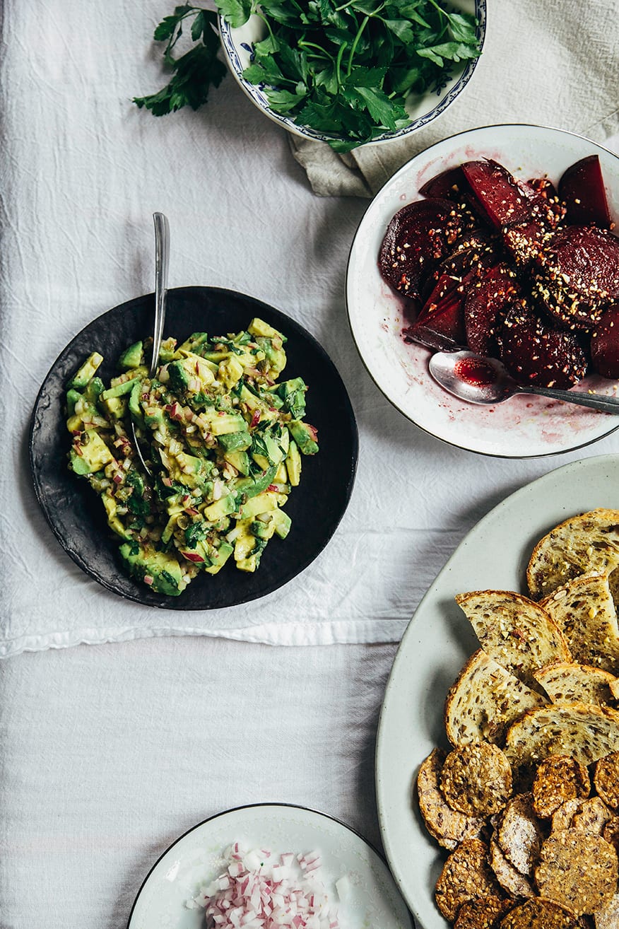 - Serve the avocado tartare with the beets, crackers/crostini, parsley leaves, and diced onion.