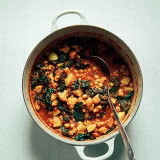 When I got home, I had a sad looking cauliflower in the fridge and a bunch of garden kale still going. With some pantry stuff, I made this! Deep-nourishing and relatively quick comfort. Lots of vegetables, spice, stew-y tomato richness, tender greens, and the heft of chickpeas to fill it out. I know I’ve featured a couple stews/soups similar to this in the past, but with the frequency that I make this on my mind, it just felt right to share. Stay cozy out there, all. xo