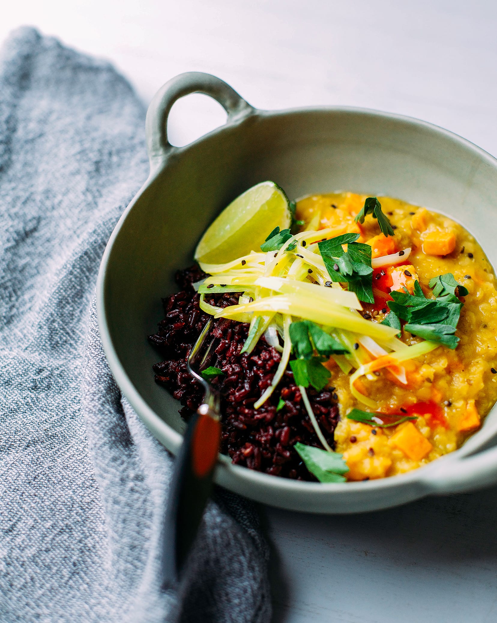 I have a hunch that a lot of us are thinking about changes and things we want to take on, either over the holiday break or into the new year. I know there will be some major ones in my house. I’m not really a juice fast kinda gal anymore, but my partner and I have both acknowledged that we need to focus-up some of our habits in terms of health and well being. Cue the easy but wholesome recipes! Make this sweet potato dal next time you’re in the mood for just that ;)