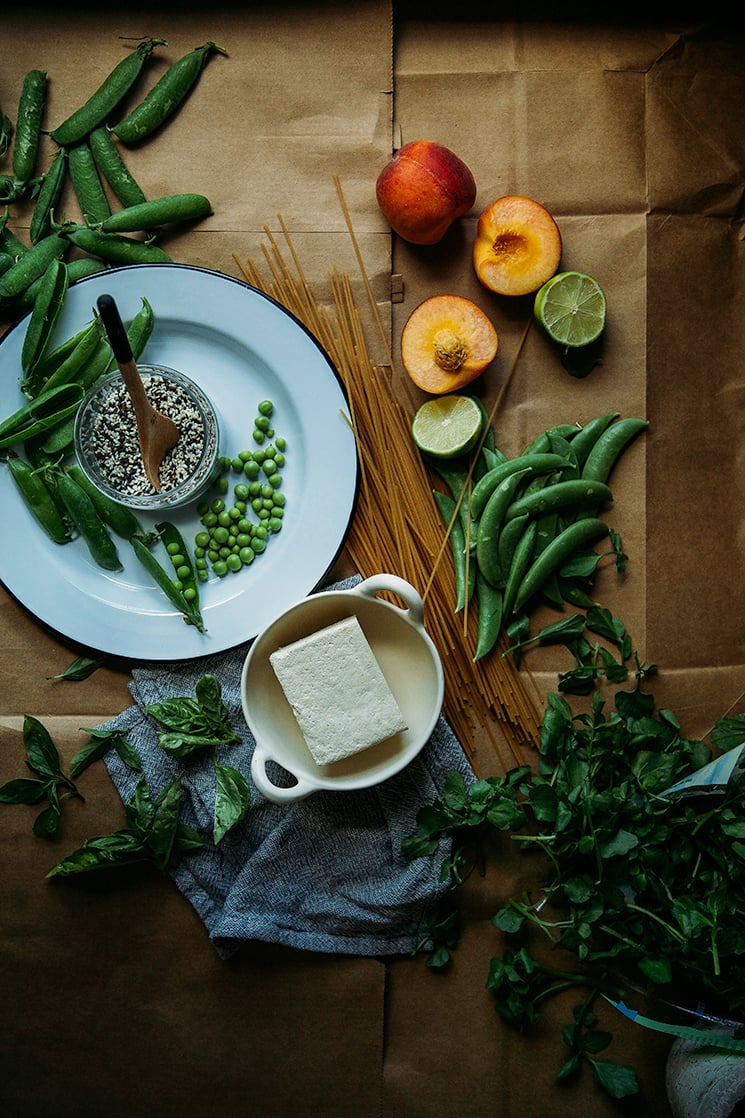 I made this easy cold noodle salad with lots of fun and weird add-ins because I feel like most people really dig a noodle salad with all the fresh goodies at a potluck/picnic/gathering sort of situation. It’s got a zippy little almond butter sauce with plenty of ginger and lime. Tofu is a once-in-a-while treat for me, so toasty little cubes on top of that veggie and noodle tangle felt pretty good. Watercress is a little pepper-y, peaches are juicy, the fresh peas are totally sweet, and the Thai basil gives a nice hit of fragrance. You could be a high-vibe hero at any picnic with this one!