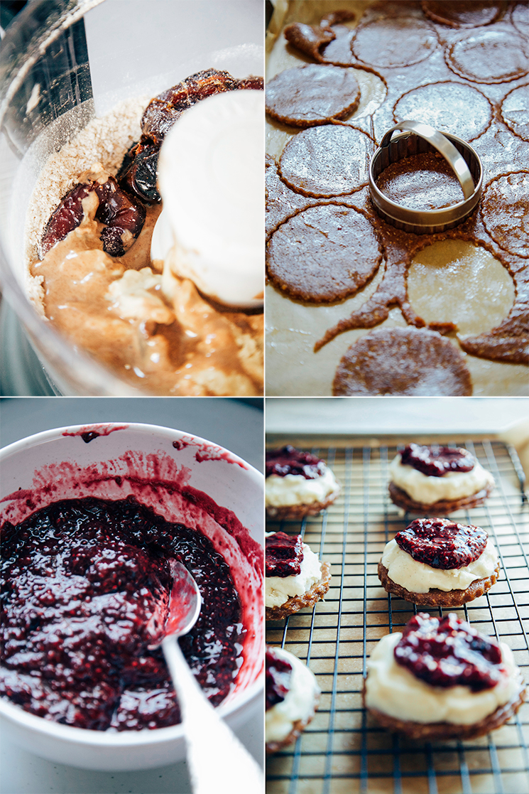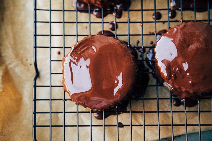 - Get out your cookies and chia jam from the freezer, and place them on the counter. Place 6 (or 12 if you made smaller ones) of the cookies on a wire rack over some parchment/newspaper. Divide the coconut butter cream amongst the 6 cookies. Pat it out with your fingers so that it evenly covers the surface of the cookie. Try to make a little depression in the middle of the cream for the jam. Drop about 1 heaped tablespoon of jam onto the center of the cream. Place another cookie on top of the jam and press lightly to squish the cookie down a bit. Spoon the melted chocolate over the wagon wheels, trying to drip it over the sides as well. Store the finished wagon wheels in the fridge.