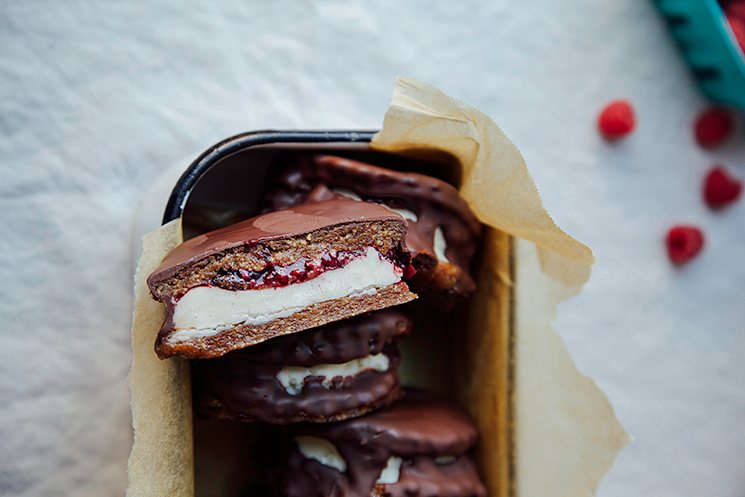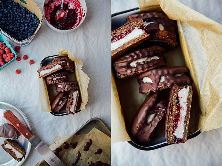 My version is maxed out with feel-good stuff like chia jam (made with the abundance of raspberries from my parents garden), vegan chocolate, and a creamy filling made from coconut butter. I’d recommend enjoying these treats outside on a stoop, your deck, or just laying in the grass–straight from the fridge too. This recipe looks like a lot of stuff and steps on the surface, but I think I was just being extra thorough. It’s some minor food processor usage, some chocolate melting, and a little freezer wait time for the most part. Nothing major except the flavour :D