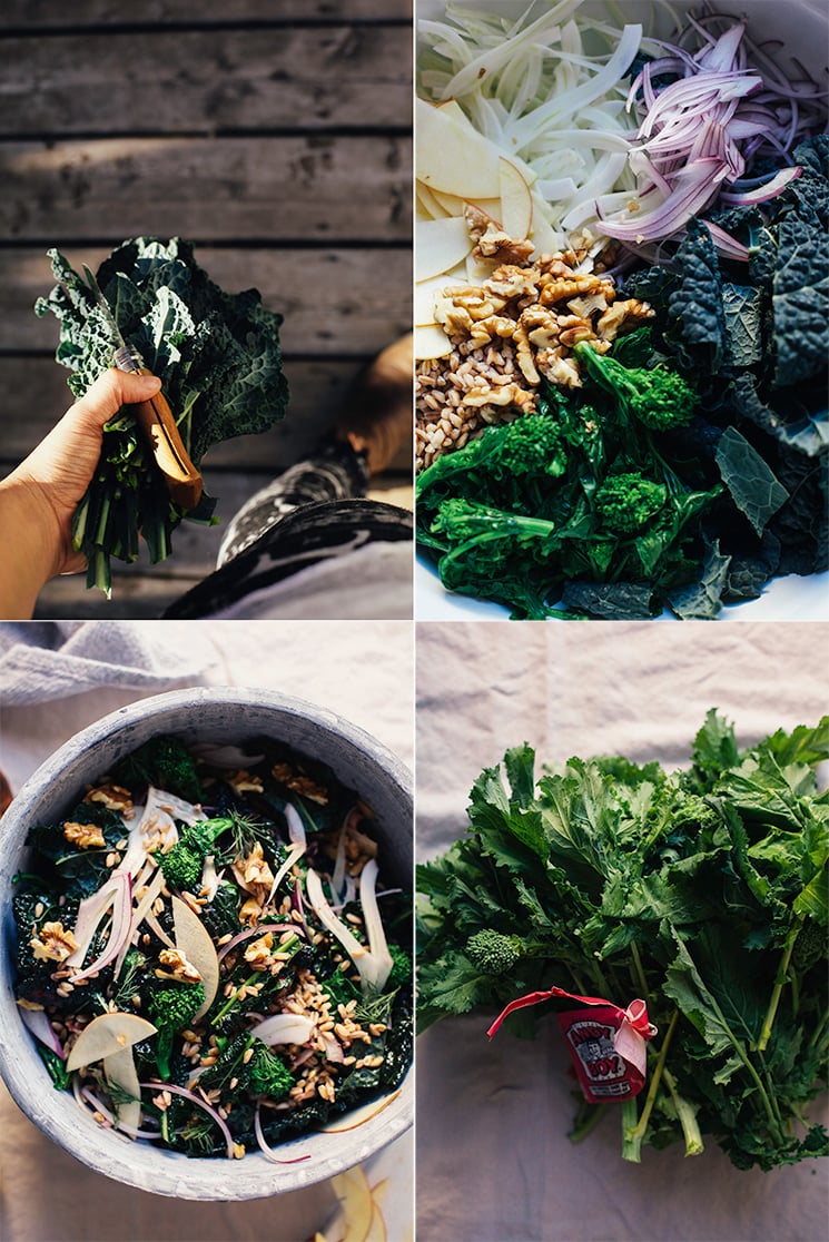 Don’t forget to eat a salad/have some vegetables for extra vibrance around this time. I created this colourful salad with kale and broccoli rabe as an unusual and light counter to all of the heavier holiday fare. There’s a hot pink cranberry-orange dressing that’s spiked with ginger and maple syrup. Chewy cooked farro fills the dish out, along with some crunchy walnuts and thin wisps of fennel, apple, and red onion. I find that incorporating lots of colours and small/thin cuts of vegetables makes for greater success with healthier dishes at large get-togethers. The small cuts seem less committal maybe? Hope you try this broccoli rabe and kale harvest salad for yourself or for a feast sometime soon :)