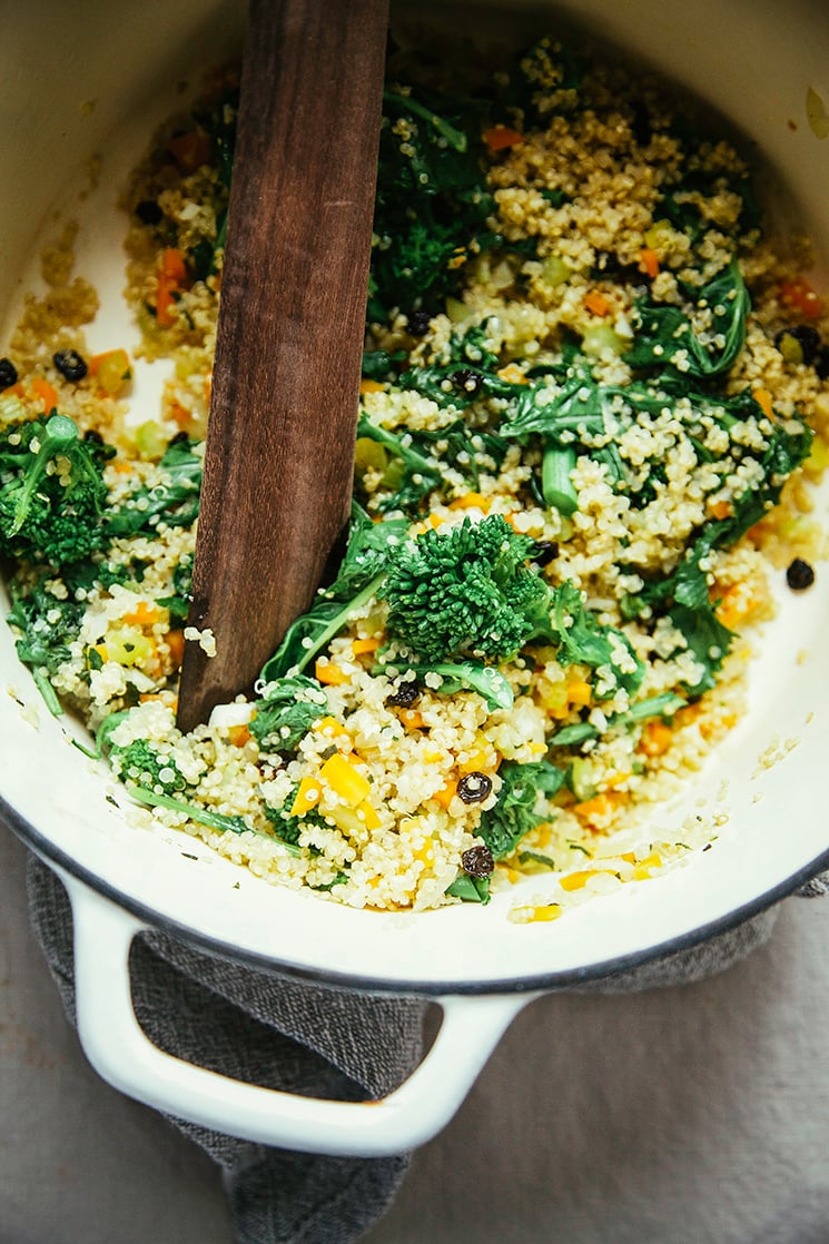 - Stir the vegetables to coat and season with salt and pepper. Add a ¼ cup of water to the pot and place the lid on top. Let the broccoli rabe steam in the pot for about 3-4 minutes. Then, remove the lid and stir in the cooked quinoa and dried currants. Remove the pot from the heat.