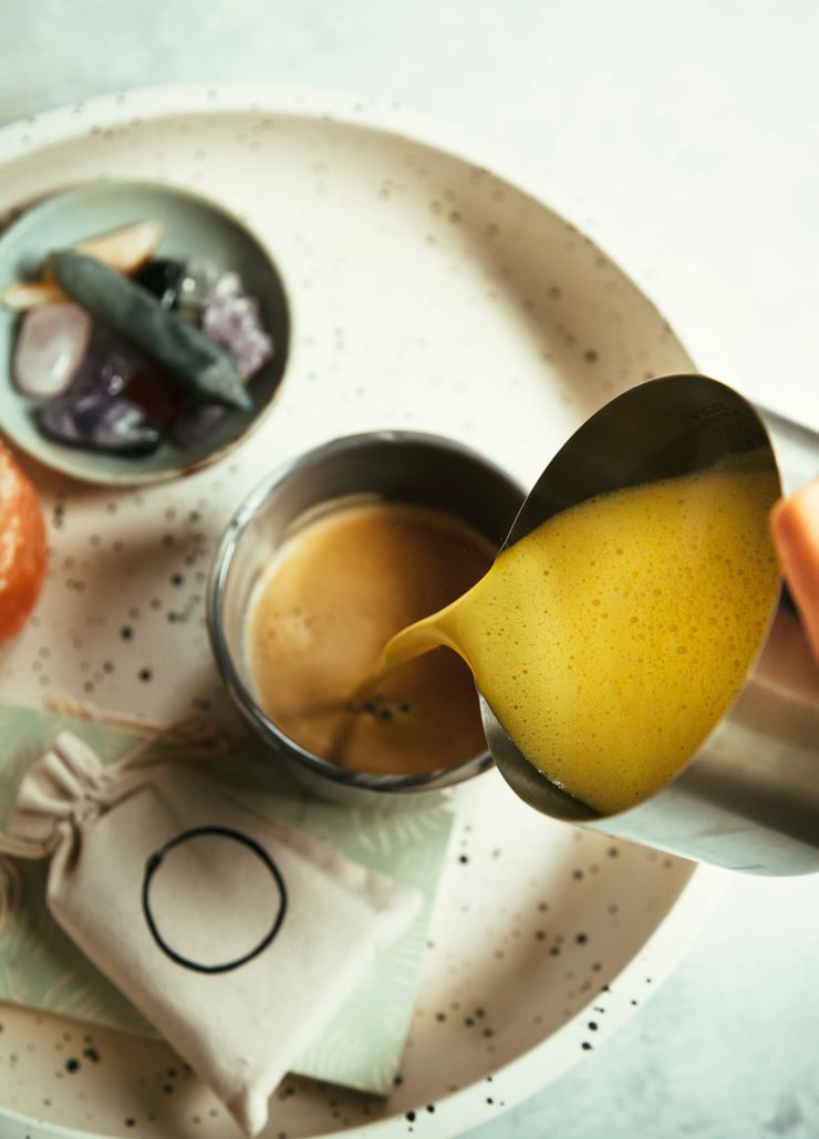 The drink is essentially a typical espresso-based latte made with a turmeric and other warm spice frothed nut milk. With respect to origin and the inspiration, the turmeric and milk combination ties to haldi doodh, the Hindi phrase for “the milk of turmeric.”