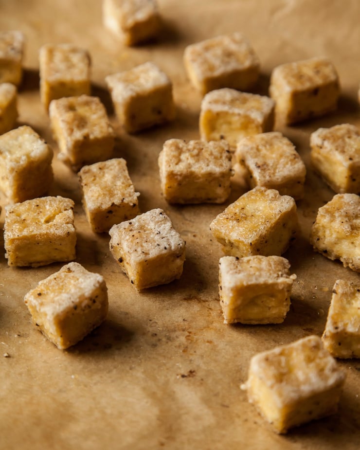 - At the 15 minute mark, take the tofu out and flip over all the pieces. Return the tofu to the oven and bake for another 15-20 minutes, or until golden and crispy on all sides.