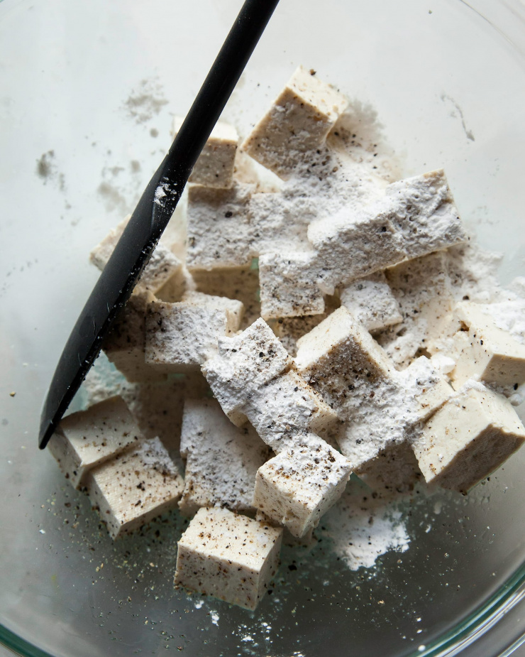 - Make the crispy tofu. Preheat the oven to 400 degrees F. Line a baking sheet with parchment paper. Dry the tofu and cut it into ¾ – 1-inch cubes. Place the tofu in a large bowl. Toss the bowl with the oil to coat. Sprinkle in the arrowroot, salt, pepper, and seasoning of choice. Quickly toss the tofu to coat again. Arrange the tofu on the baking sheet. Slide the tofu into the oven and bake for 15 minutes.