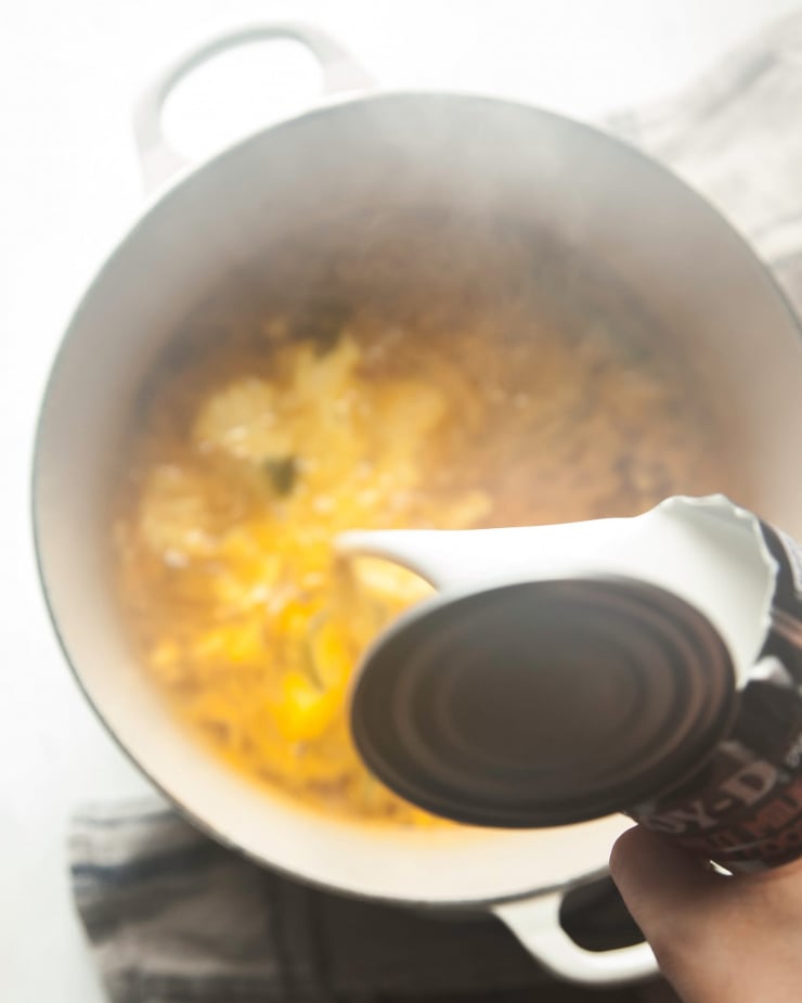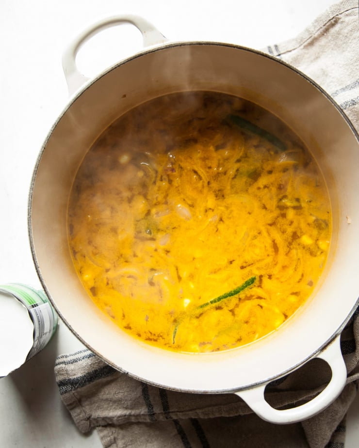 - Add the water and the coconut milk to the pot and stir. Bring the mixture to a boil, and then lower to a simmer. Simmer, uncovered for 15 minutes. Set a fine mesh strainer over a large bowl.