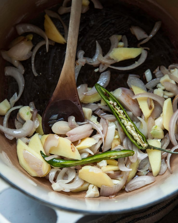 - Make the golden coconut broth. Heat a large pot over medium heat. Add the avocado oil and swish it around. Transfer the shallots to the pot and stir. Keep sauteing and stirring the shallots until they are slightly browned and soft. Then, add the ginger, garlic, chili, and the lime zest. Stir and saute until fragrant and garlic/ginger is slightly softened, about 2 minutes. Add the turmeric to the pot and season with salt and pepper. Stir the vegetables.