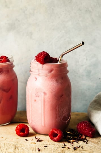 This invigorating golden peach sunrise smoothie has contrasting notes of spice, sweetness, and tart raspberries.