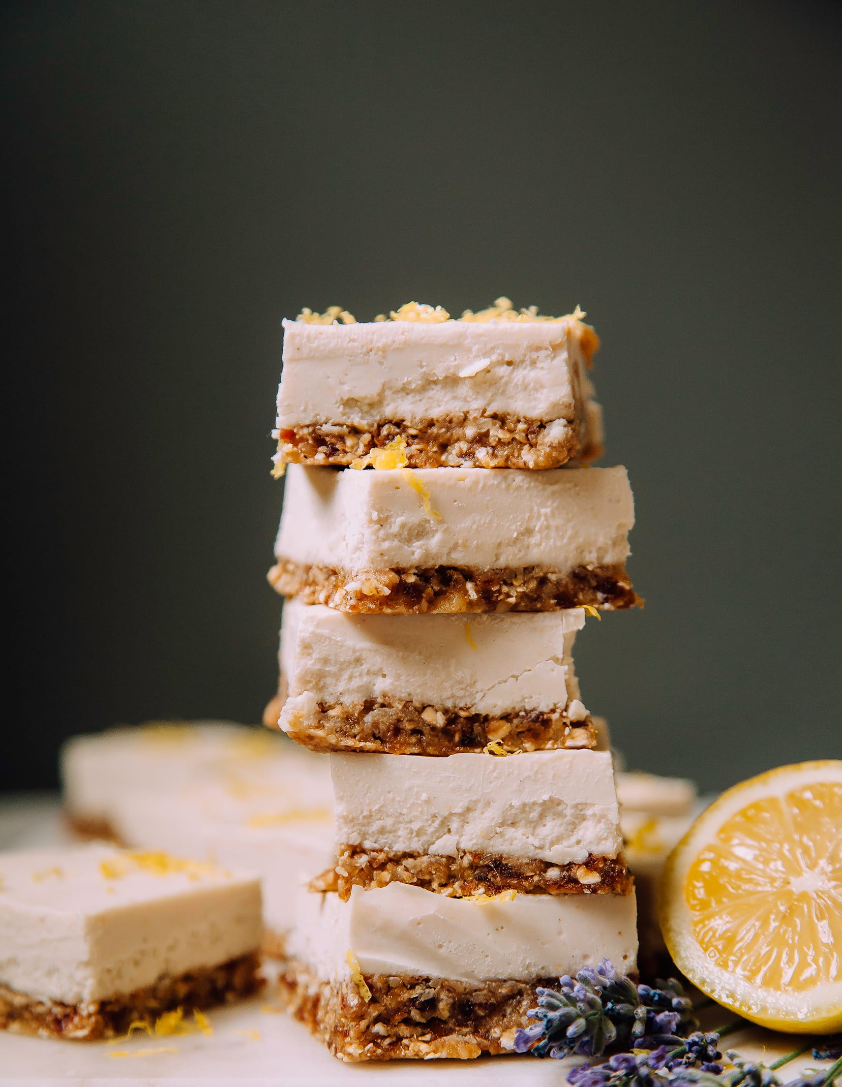 - Make the filling: In a high-speed blender, puree the coconut cream, cashews, lemon zest, lemon juice, maple syrup, and salt until smooth. Pour the filling over the crust and freeze overnight. Let thaw at room temperature for 20 minutes before slicing into bars and serving.