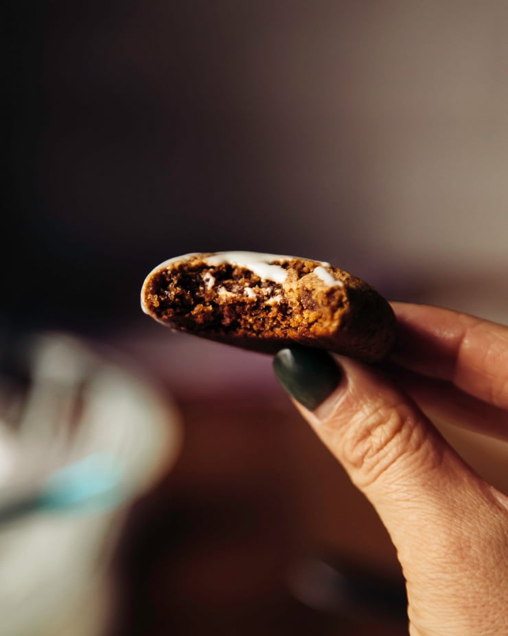 The soft-baked vibe of these cookies is so nice. Like little comfy spiced pillows. I would lay down in a bed of these, no question. These were drizzled with melted vegan white chocolate for some extra holiday drama and indulgence. I buy this one, but there are lots of recipes online (like this one) for making your own as well. Hope you give them a try! Catch ya back here soon for more treats ;)
