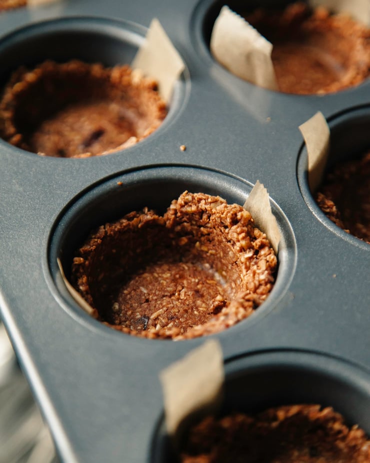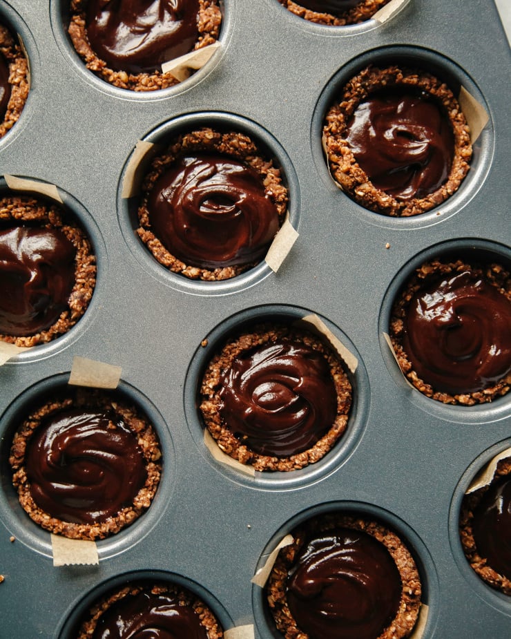 - In the muffin tin, drop about 3 tablespoons of the dough into each cup. Lightly spread it out with your fingers. Then, with the bottom of a shot glass (or something similarly sized), press an indent into each portion of dough to form a “cup.” Place the prepared cups in the fridge while you make the ganache.