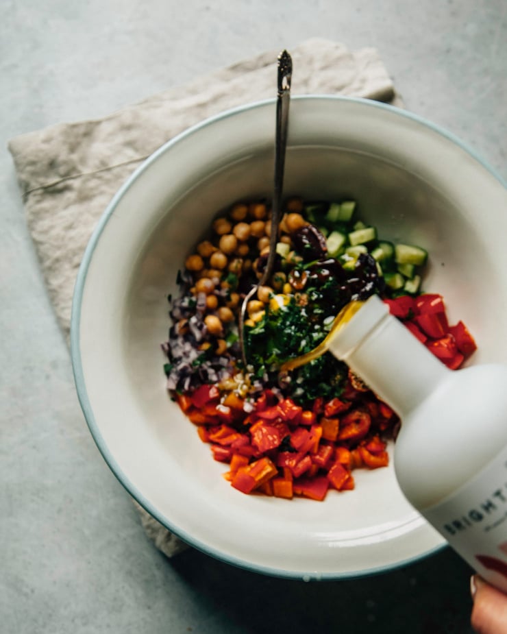 - While potatoes are roasting, make the veg salad. In a medium bowl, combine the cucumber, tomatoes, red onion, roasted red pepper, olives, parsley, chickpeas, shawarma spice, lemon juice, olive oil, and salt. Toss to combine and set aside.