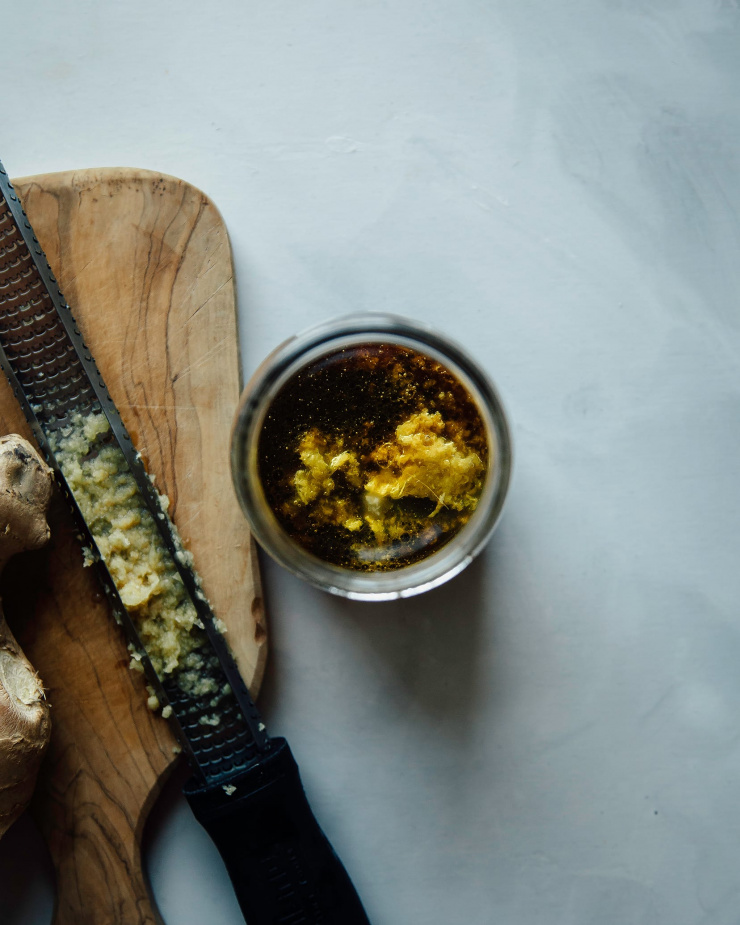 - Make the ginger soy dressing: In a sealable jar, combine the tamari, rice vinegar, avocado oil, ginger, and maple syrup. Tightly close the lid on the jar and shake vigorously to combine. Set aside.