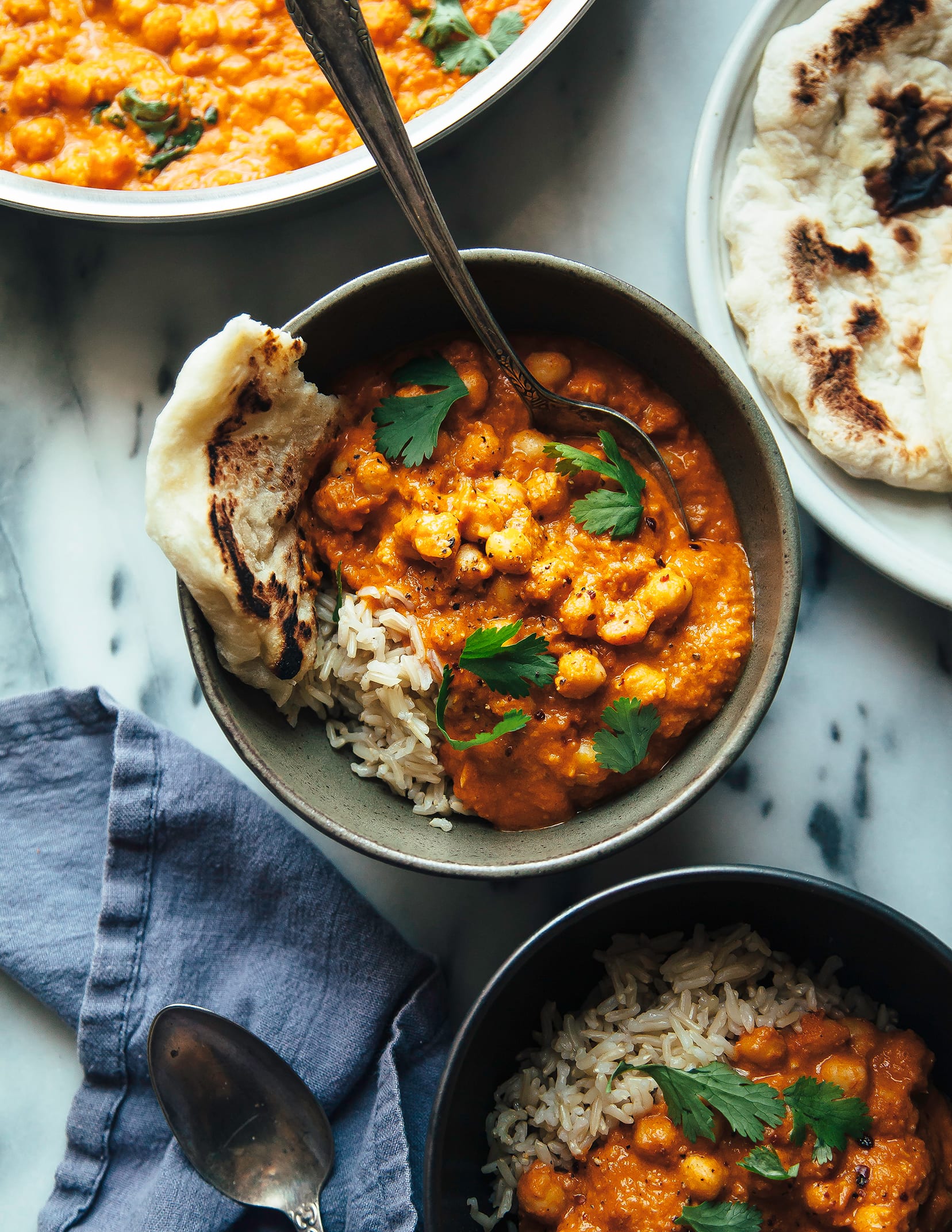 2. CREAMY VEGAN “BUTTER” CHICKPEAS: Cooked chickpeas, and a simple creamy sauce with canned tomatoes, spices and whizzed up raw cashews hits the spot with some fluffy brown rice. If you don’t have raw cashews or a high speed blender to make the cream, substitute 1 cup full fat coconut milk for the cashews, water, and maple syrup.