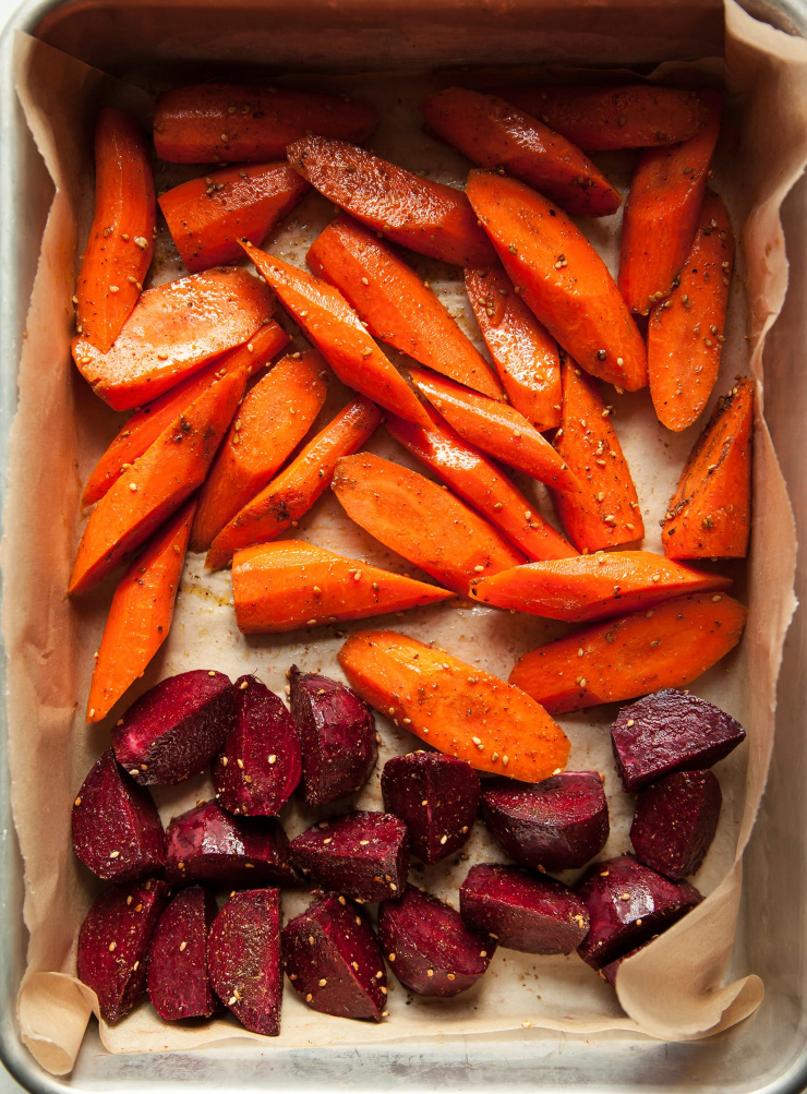 - Place the chopped carrots and beets in the baking dish and toss them with the olive oil, za’atar, salt and pepper. Once the vegetables are evenly coated, spread them out into a single layer and slide the dish into the oven. Roast the vegetables for 1 hour, taking them out at the halfway point to stir them up and flip them over.