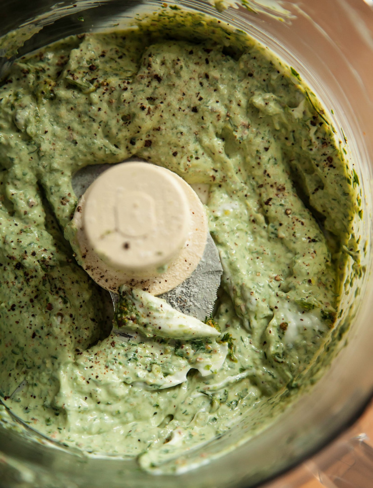 - Make the herbed jalapeño yogurt sauce: In a food processor, combine the herbs, jalapeño, garlic, pistachios, olive oil, lemon juice, salt, and pepper. Pulse the machine a few times until everything is finely chopped, scraping down the sides of the bowl with a spatula if necessary. Add the non-dairy yogurt to the food processor and pulse until the sauce is fully combined and uniformly light green. Check the sauce for seasoning and adjust if necessary.