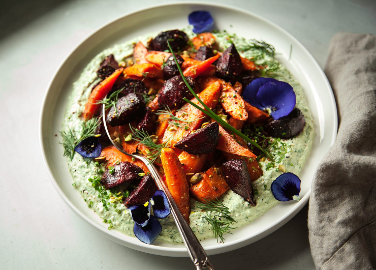 - Garnish the grounding roasted roots and herbed jalapeño yogurt sauce with extra chopped herbs and pistachios. Serve warm or at room temperature.