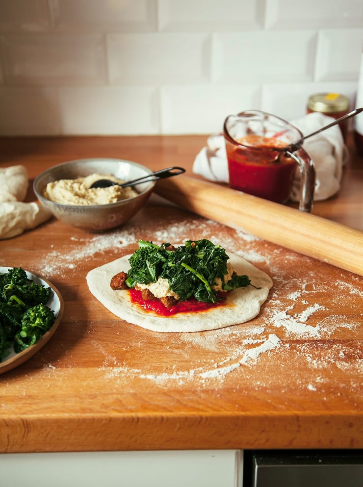 - Retrieve your cashew ricotta from the fridge. Place it near your workspace along with the cooked vegan sausage, marinara, and cooked broccoli rabe. In the center of each dough circle, spoon 2 tablespoons of marinara, ¼ of the cooked vegan sausage, 2 tablespoons of the cashew ricotta, and ¼ of the cooked broccoli rabe. Repeat with remaining dough and ingredients.