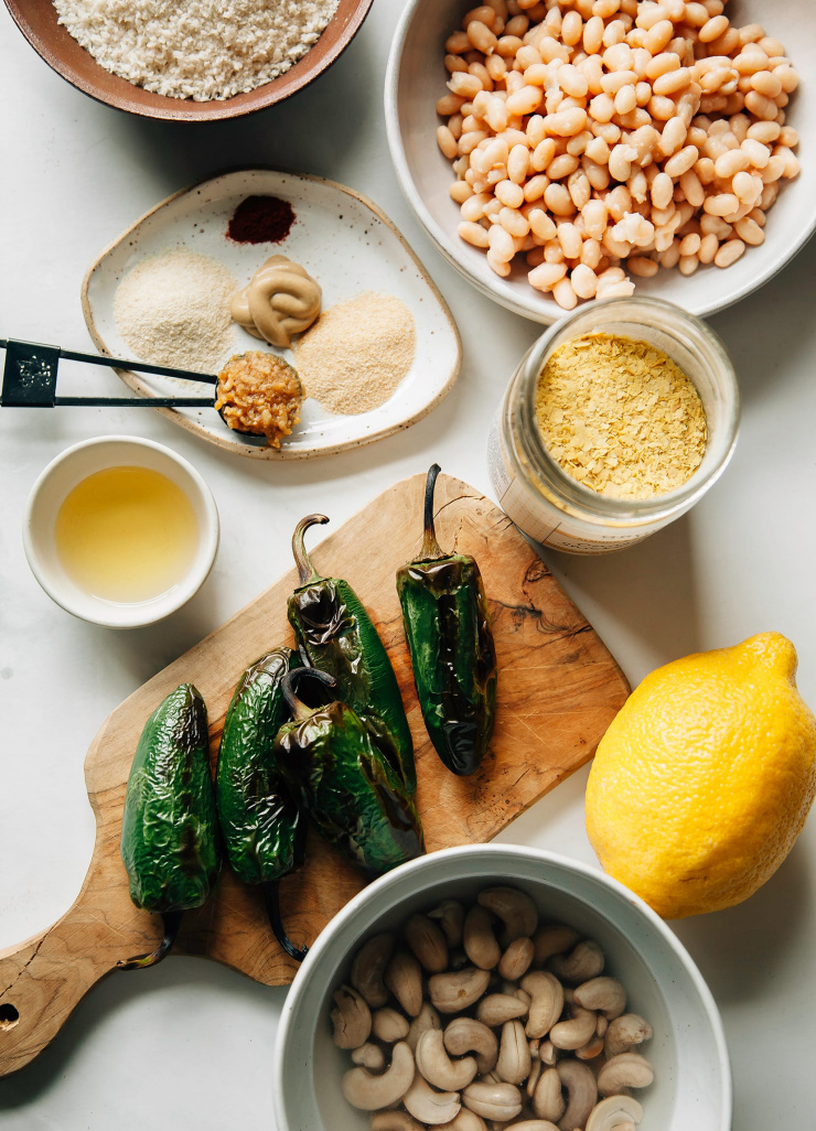 - While jalapeños are steaming, make the base of the dip. In an upright blender, combine the white beans, cashews, nutritional yeast, garlic clove, garlic powder, onion powder, smoked paprika, lemon juice, miso, dijon mustard, agave nectar, water, salt, and pepper. Blend the mixture on high until completely smooth, stopping to scrape down the sides of your blender pitcher if necessary. If the blender is struggling to whip up everything, add more water by the tablespoon until it gets going.