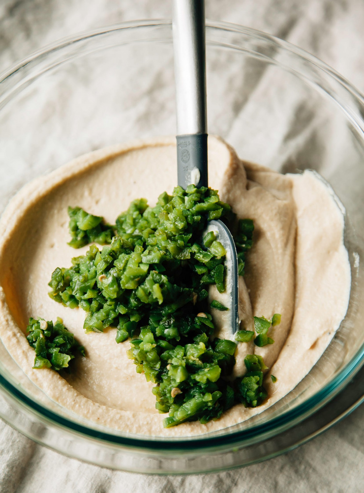 - Back to the charred and steamed jalapeños! Uncover them and carefully peel off the charred skins. Cut the roasted jalapeños in half and scoop out the seeds if you like (or leave some in if you want some heat). Finely mince the roasted jalapeños and then stir them into the dip base. Smooth out the top of the dip in the serving dish.