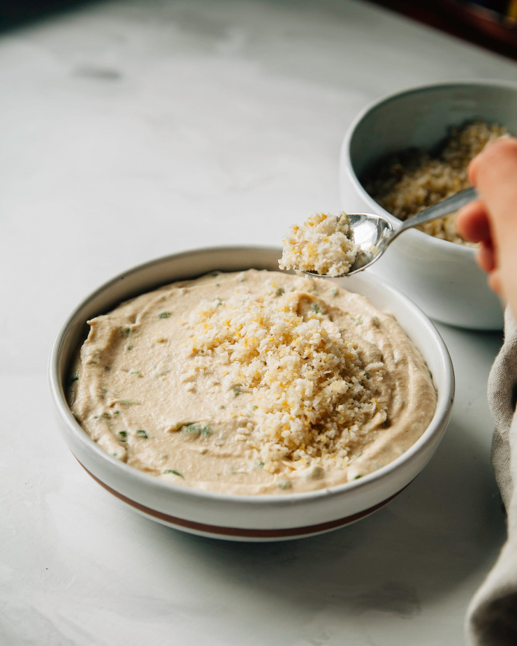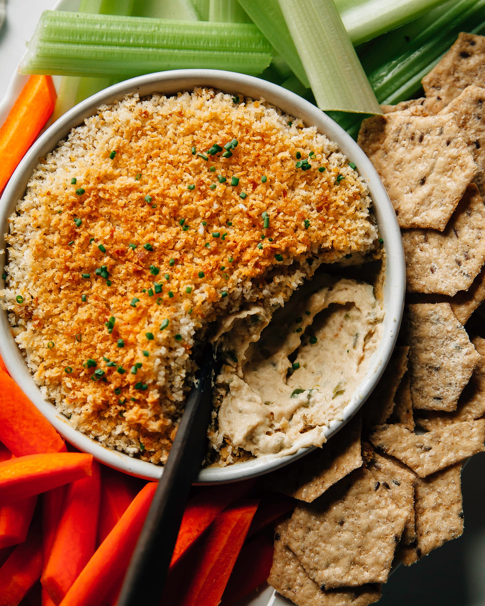 The base is mostly white beans, some cashews, lots of lemon, spices, my all-time favourite thing ever nutritional yeast, miso, and some well-charred jalapeños. Ours turned out HOT because I got a little cocky with the amount of seeds that I decided to include, oops! It was still so delicious and like a lot of spicy snacks, it’s hard to stop eating it. You can control the level of spice, by omitting or including however many seeds/inner membranes of the peppers that you can handle. It tastes even better the next day if you’re planning to make it ahead. Just save the breadcrumb and baking step for right before your serving time.
