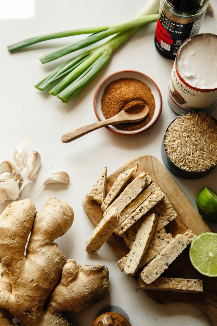 - Serve the sticky ginger tempeh hot with coconut rice and sliced green onions.