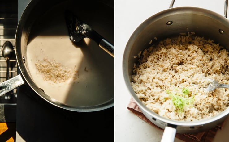 - Add the lime zest and juice to the coconut rice and fluff/lightly stir with a fork. Return the lid to the pot and let it sit on the warm stove for 3-4 minutes, or keep warm until ready to serve.